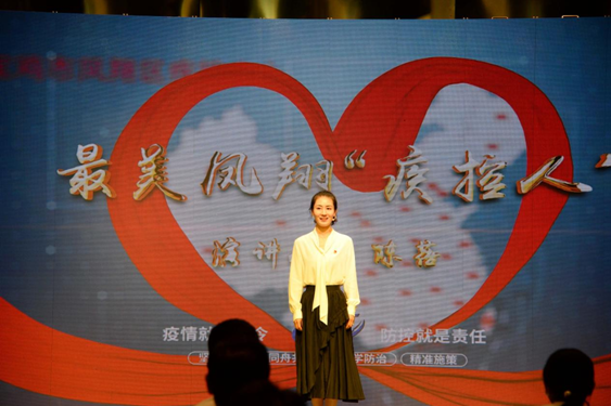 “防護(hù)服真捂啊,結(jié)束一天工作,摘掉護(hù)目鏡的那一刻,臉上是慘不忍睹的壓痕,卻渾然感覺不到疼痛。我的前輩對我說:‘孩子,你工作的樣子最美麗,你的樣子,就是中國的樣子,你什么樣,中國就什么樣!’……”來自區(qū)疾控中心的90后選手陳蓓激情飽滿,動(dòng)情之處,選手幾度哽咽,臺下觀眾掌聲如潮。