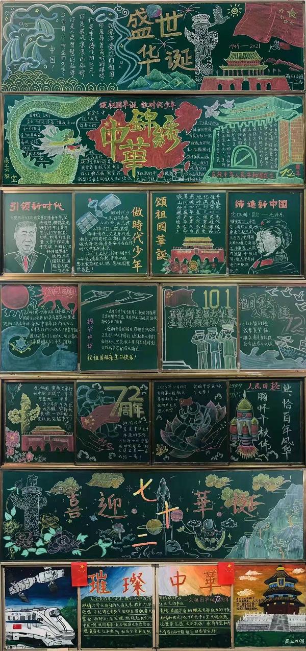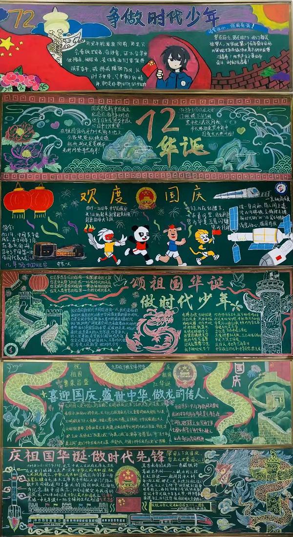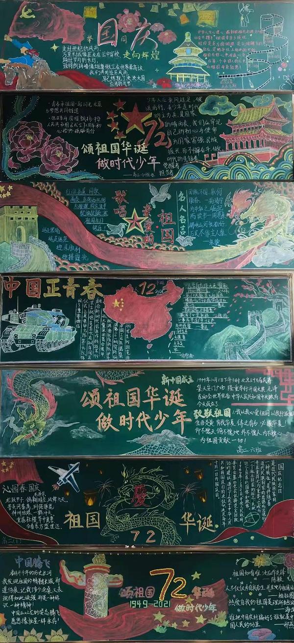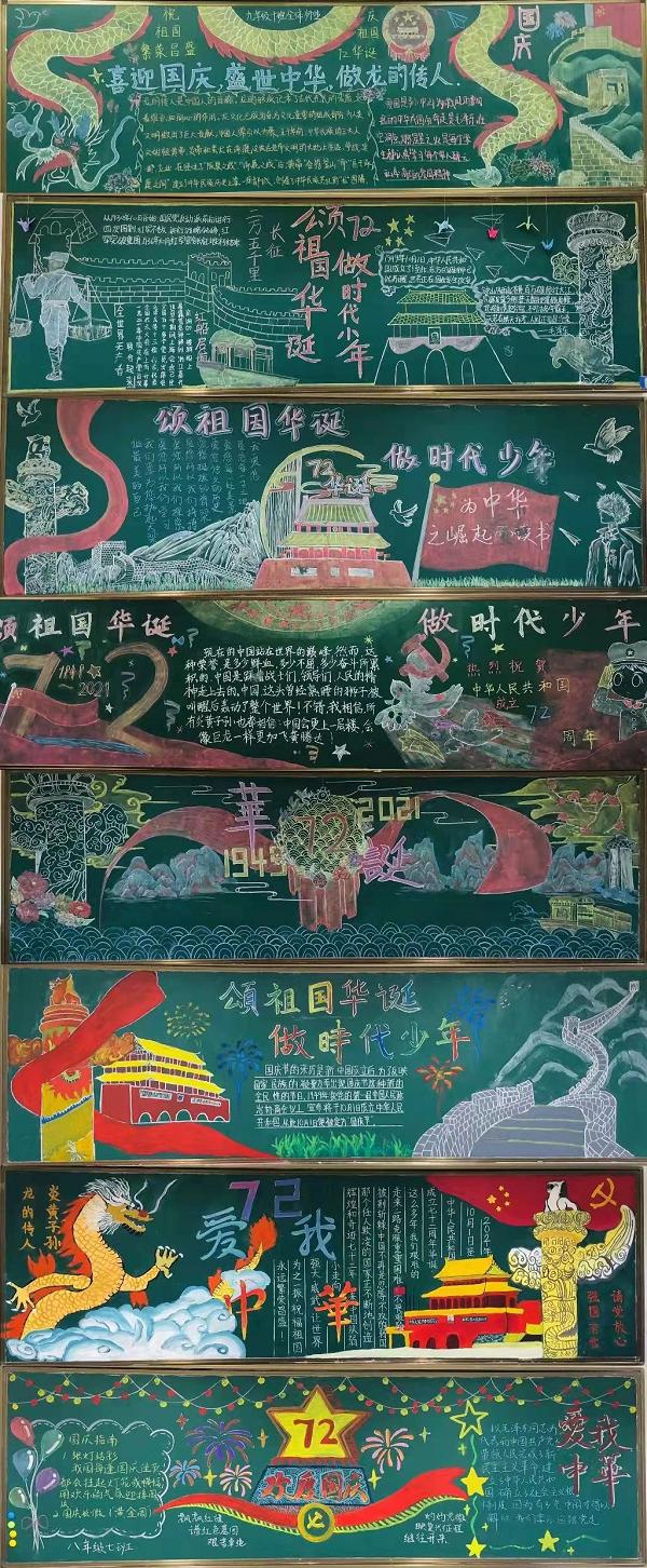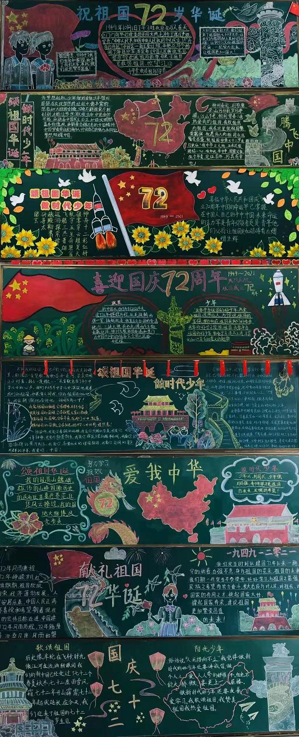 經(jīng)過(guò)兩周時(shí)間的精心布置,各個(gè)年級(jí)的同學(xué)們?cè)诶蠋煹闹笇?dǎo)下,自己搜集資料、設(shè)計(jì)排版、調(diào)整美化,用別出心裁的創(chuàng)意與稚嫩工整的字跡完成了一幅幅畫面精美、文字深情的專題黑板報(bào),表達(dá)對(duì)祖國(guó)母親的尊敬和熱愛。