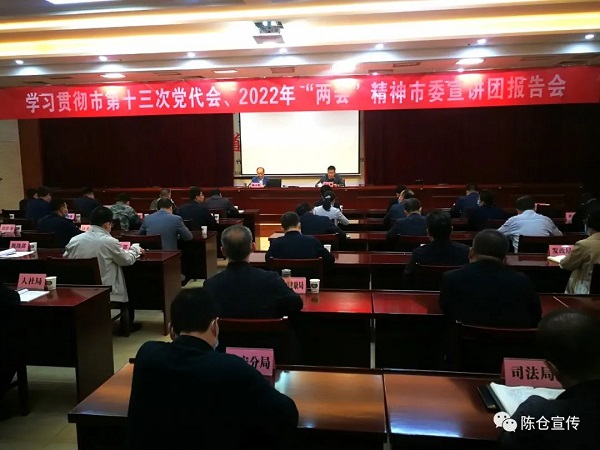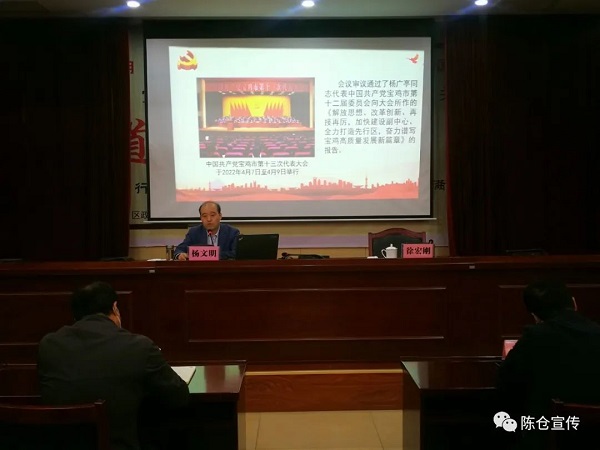 4月27日,學(xué)習(xí)貫徹市第十三次黨代會(huì)、2022年“兩會(huì)”精神市委宣講團(tuán)報(bào)告會(huì)在陳倉(cāng)區(qū)舉行。市委宣講團(tuán)成員、市委宣傳部常務(wù)副部長(zhǎng)楊文明為陳倉(cāng)區(qū)90余名黨員領(lǐng)導(dǎo)干部作專題輔導(dǎo)報(bào)告。