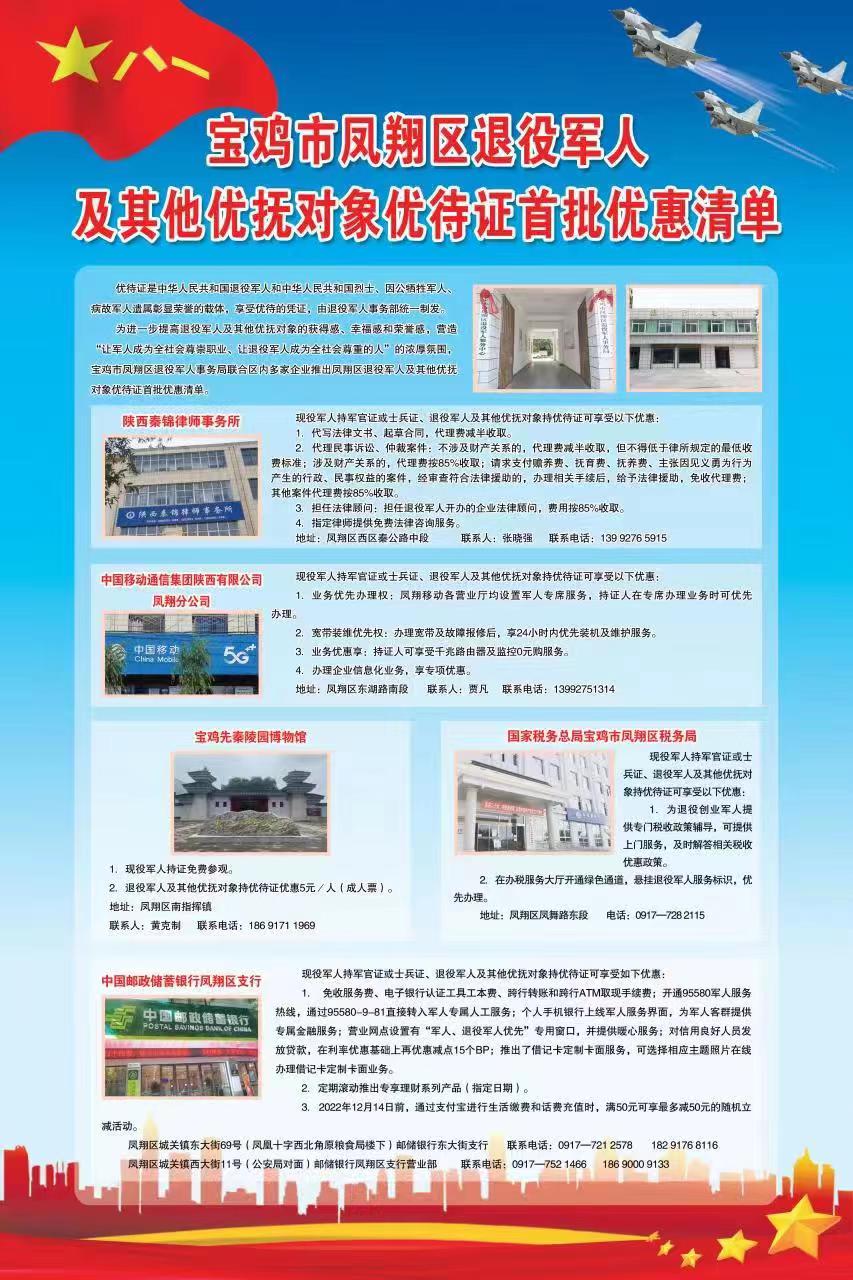 鳳翔區(qū)退役軍人事務(wù)局為進(jìn)一步提高退役軍人及其他優(yōu)撫對象的獲得感、幸福感和榮譽(yù)感,營造“讓軍人成為全社會尊崇的職業(yè)、讓退役軍人成為全社會尊重的人”的濃厚氛圍,聯(lián)合區(qū)內(nèi)18家企業(yè)推出鳳翔區(qū)退役軍人及其他優(yōu)撫對象優(yōu)待證首批優(yōu)惠,讓退役軍人享受到實實在在的優(yōu)惠政策,以實際行動詮釋了社會責(zé)任和企業(yè)精神,促進(jìn)了我區(qū)“雙擁”工作再上新臺階。