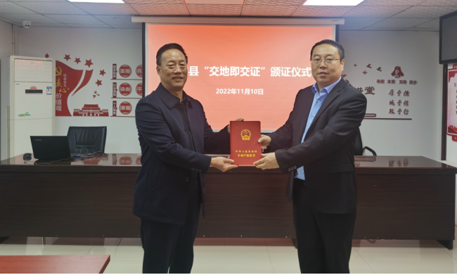 11月10日,武功縣移動(dòng)公司負(fù)責(zé)人從武功縣不動(dòng)產(chǎn)登記局負(fù)責(zé)人手中接過不動(dòng)產(chǎn)權(quán)證書。