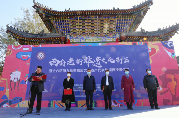 此次活動由寶雞市文化和旅游局、金臺區(qū)人民政府主辦,金臺區(qū)文化和旅游局承辦,西府天地管委會、金臺區(qū)文化館、西府老街文化旅游景區(qū)協(xié)辦。寶雞市文化和旅游局黨組書記、局長周保君為寶雞市首條“非遺文化街區(qū)”——“西府老街非遺文化街區(qū)”授牌,隨后出席此次儀式的市區(qū)領(lǐng)導(dǎo)共同為金臺區(qū)第九批區(qū)級非遺代表性項目授牌。