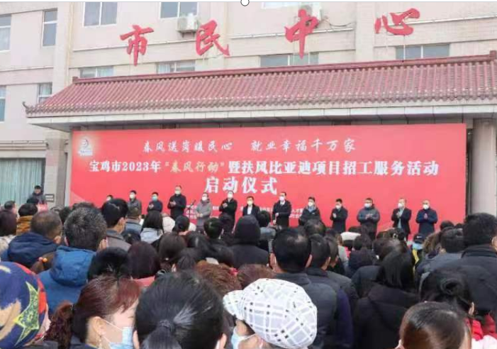 伴著春節(jié)來臨的喜氣,迎著初春乍暖還冷的天氣,1月12日上午,寶雞市2023年“春風(fēng)行動(dòng)”暨扶風(fēng)比亞迪項(xiàng)目招工服務(wù)活動(dòng)在扶風(fēng)縣市民中心廣場啟動(dòng),為全市2023年就業(yè)工作、重點(diǎn)項(xiàng)目建設(shè)的良好開局揚(yáng)帆起航。通過線上線下、直播帶崗,來自江蘇昆山、徐州邳州、浙江寧波及省內(nèi)外的231家用人單位提供就業(yè)崗位5100余個(gè),涉及制造業(yè)、服務(wù)業(yè)、物流及食品加工業(yè)。