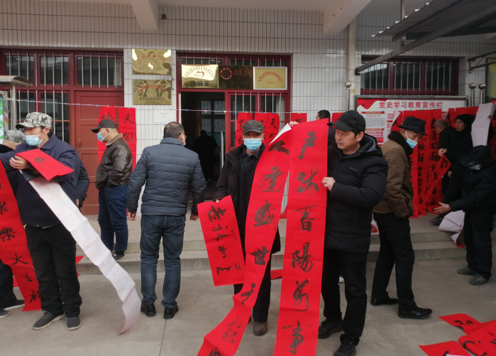 當(dāng)天,寶雞市鳳翔區(qū)文學(xué)藝術(shù)界聯(lián)合會(huì)組織區(qū)書法家協(xié)會(huì)、美術(shù)家協(xié)會(huì)、詩聯(lián)書畫家協(xié)會(huì)和廣隸印社等四個(gè)協(xié)會(huì)十余名專業(yè)老師來到龐家務(wù)村,開展“送春聯(lián)進(jìn)萬家”活動(dòng)。連續(xù)幾日低溫天氣,室內(nèi)只有5℃左右。參與活動(dòng)的老師們分成兩組,擺開架勢(shì),揮毫潑墨,一幅幅遒勁有力、流暢舒展的春聯(lián)出現(xiàn)在圍觀群眾面前,博得大家嘖嘖稱贊。