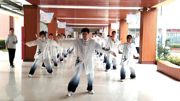 來到連廊,太極社的學(xué)生們正在表演趙堡太極拳。我校是趙堡太極拳傳承基地,習(xí)練趙堡太極拳,是我校大課間活動的創(chuàng)新形式。看到學(xué)生行云流水的表演,胡主任欣慰的說道,練拳很有意義,推廣太極拳的學(xué)校并不多,東城一中堅(jiān)持傳承傳統(tǒng)文化,給孩子不一樣的中學(xué)生活,讓孩子受益一生,值得借鑒學(xué)習(xí)。