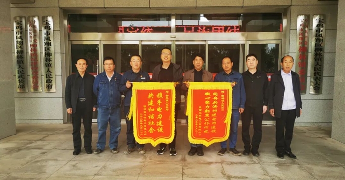 2023年9月26日,國網(wǎng)寶雞供電公司建設部和陜西送變電工程有限公司相關工作人員為感謝柳林鎮(zhèn)人民政府在寶雞千河330千伏輸變電工程中提供的支持和幫助,將兩面錦旗“攜手電力建設 共建和諧社會”、“同舟共濟推進電網(wǎng)建設 凝心聚力彰顯公仆作風”送到寶雞市鳳翔區(qū)柳林鎮(zhèn)人民政府。
