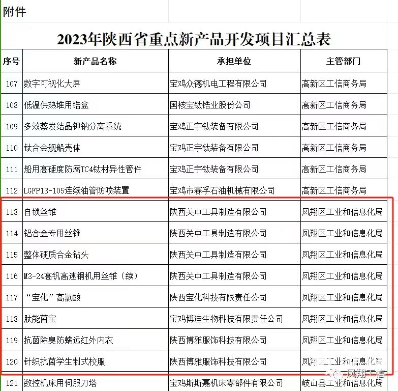 近期,省工信廳發(fā)布2023年陜西省重點新產(chǎn)品開發(fā)項目,鳳翔區(qū)陜西關(guān)中工具制造有限公司、陜西寶化科技有限責(zé)任公司、寶雞博迪生物科技有限責(zé)任公司、陜西博雅服飾科技有限公司等4戶企業(yè)的自鎖絲錐、“寶化”高氯酸、鈦能菌寶等8項新產(chǎn)品開發(fā)項目成功入選!