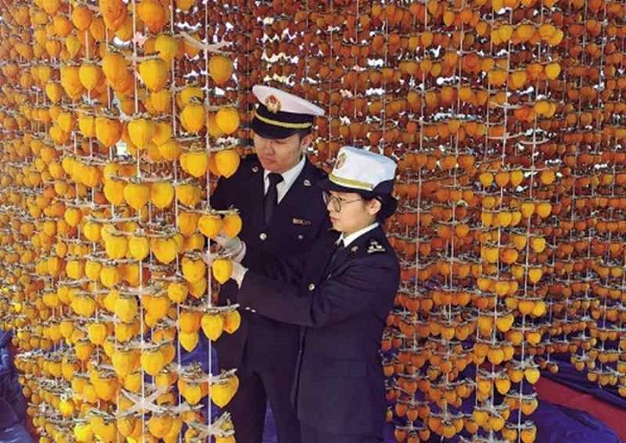 陜西渭南海關工作人員對出口柿餅進行檢驗。 受訪者供圖