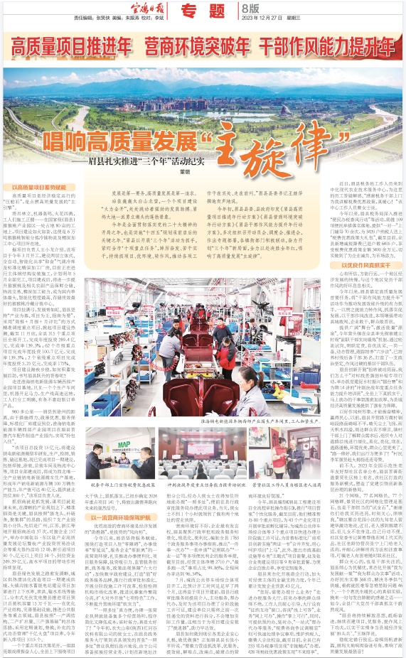 今年初,陜西省眉縣縣委、縣政府印發(fā)《眉縣高質(zhì)量項目推進年行動方案》《眉縣營商環(huán)境突破年行動方案》《眉縣干部作風能力提升年行動方案》,多次組織召開動員會、調(diào)度會、推進會,作出專題部署,各鎮(zhèn)街部門積極聯(lián)動,奮力開創(chuàng)“三個年”新局面,全力以赴決勝全年紅,唱響了高質(zhì)量發(fā)展“主旋律”。