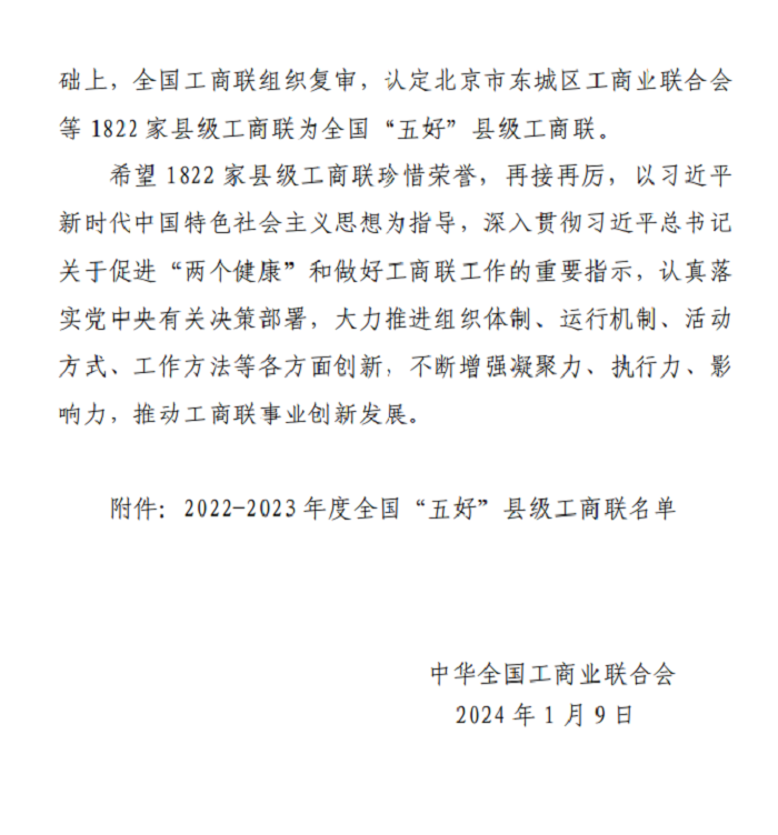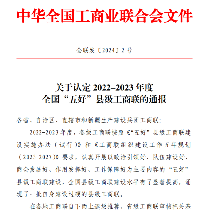 近日,全國工商聯(lián)下發(fā)【2024】2號文件《關于認定2022—2023年度全國“五好”縣級工商聯(lián)的通報》,寶雞市鳳翔區(qū)工商聯(lián)被全國工商聯(lián)評為全國“五好”縣級工商聯(lián)。