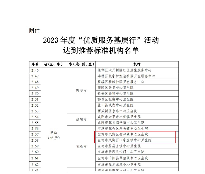 近日,國(guó)家衛(wèi)生健康委、國(guó)家中醫(yī)藥管理局下發(fā)《關(guān)于對(duì)2023年度“優(yōu)質(zhì)服務(wù)基層行”活動(dòng)表現(xiàn)突出服務(wù)優(yōu)質(zhì)機(jī)構(gòu)予以通報(bào)表?yè)P(yáng)的通知》,鳳翔區(qū)柳林鎮(zhèn)中心衛(wèi)生院、田家莊鎮(zhèn)中心衛(wèi)生院達(dá)到“優(yōu)質(zhì)服務(wù)基層行”活動(dòng)推薦標(biāo)準(zhǔn),表現(xiàn)突出,成效顯著,獲得通報(bào)表?yè)P(yáng)。