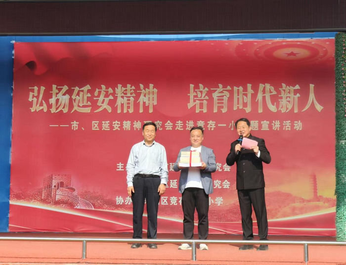 活動(dòng)開始前,市、區(qū)延安精神研究會(huì)領(lǐng)導(dǎo)、宣講團(tuán)成員參觀了競存學(xué)校校史館;活動(dòng)現(xiàn)場,寶雞市延安精神研究會(huì)領(lǐng)導(dǎo)為競存一小師生贈(zèng)送了紅色書籍,區(qū)延安精神研究會(huì)為鳳翔區(qū)競存第一小學(xué)和陳村鎮(zhèn)紫荊村西北野戰(zhàn)軍司令部舊址頒發(fā)了“延安精神教育基地”牌匾。