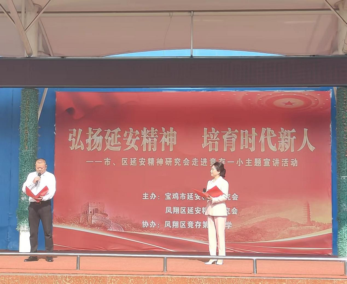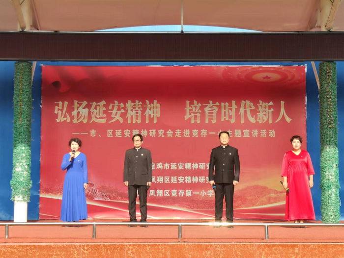 本次活動(dòng)由寶雞市延安精神研究會(huì)、鳳翔區(qū)延安精神研究會(huì)主辦,鳳翔區(qū)競存第一小學(xué)協(xié)辦。寶雞市延安精神研究會(huì)副會(huì)長謝麗娟、劉一良,秘書長陸軍;鳳翔區(qū)延安精神研究會(huì)會(huì)長張軍良;常務(wù)副會(huì)長芮曉楓,副會(huì)長李耀武、楊舟平、高有元,秘書長張衛(wèi)星,鳳翔區(qū)教育體育局副局長姚劍鋒;鳳翔區(qū)委宣傳部新聞與網(wǎng)絡(luò)組組長邵曉奎;競存第一小學(xué)校長程擷英,市、區(qū)兩級(jí)延安精神宣講團(tuán)成員,鳳翔區(qū)延安精神研究會(huì)部分會(huì)員、競存第一小學(xué)師生一千余人參加活動(dòng)。
