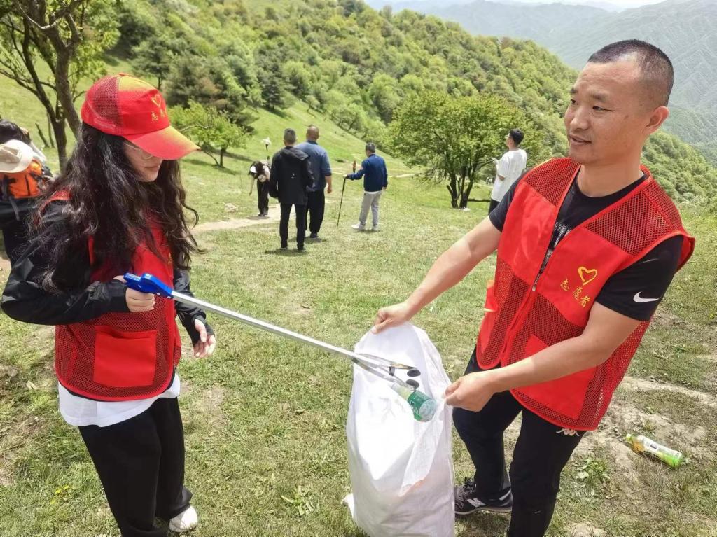 早上9點,他們從羅敷鎮(zhèn)政府出發(fā)前往華陽高山草甸,開啟了凈化山野美麗山間行動。周末到華陽高山草甸休閑賞風景的游客絡繹不絕,食品包裝袋、手紙和飲料瓶等垃圾隨處可見,我們按照指定路線登山,同時負責清理和收集路線上的垃圾,沿途他們不停地彎腰撿起視野里的每一片垃圾。炎炎烈日照亮了他們前行的道路,暴汗如雨澆不滅他們內心的火焰,坎坷山路阻不斷他們清山的決心。清山行動不僅清潔了山野,同時激發(fā)著周圍人對公益環(huán)保事業(yè)的熱情,很多山友半路自發(fā)加入了他們的隊伍。