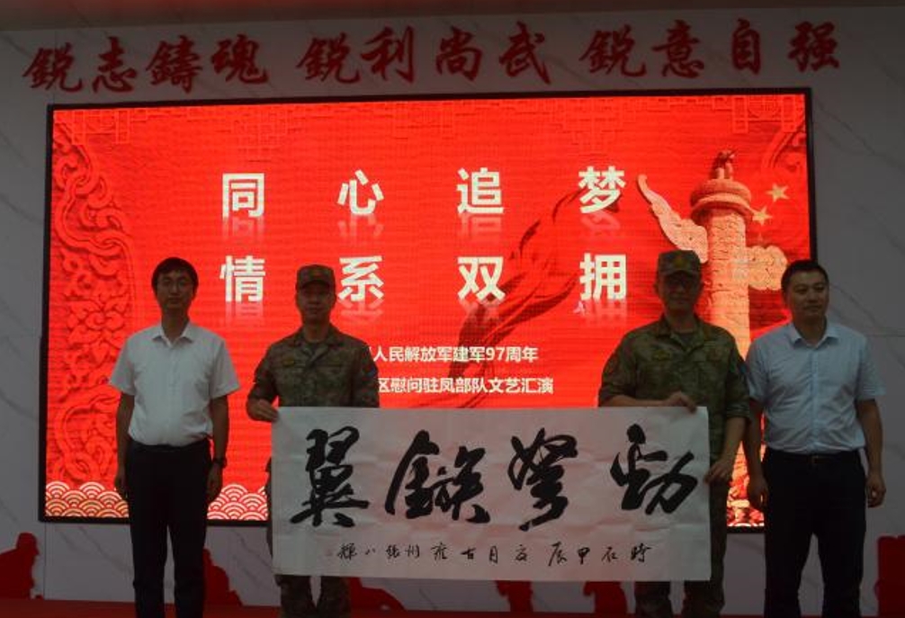 文藝匯演進軍營。7月17日,區(qū)委常委、政法委書記郭亞波,區(qū)政府副區(qū)長李紅召帶領(lǐng)區(qū)雙擁文藝匯演小分隊走進駐鳳某部,為部隊送去精彩的文藝演出,并向部隊贈送了精美的書法作品。區(qū)退役軍人事務局黨組書記、局長、雙擁辦主任在活動前發(fā)表誠摯的致辭,向駐鳳部隊官兵致以節(jié)日的祝福。文藝匯演在歡快的舞蹈《不忘初心》中拉開帷幕,部隊官兵的刺殺操《精武報國》,士氣高昂、勢如破竹,展現(xiàn)了新時代軍人的優(yōu)良作風、忠誠擔當,將現(xiàn)場氛圍推向高潮。文藝匯演在歌伴舞《中國朝前走》和官兵經(jīng)久不息的掌聲中完美帷幕。