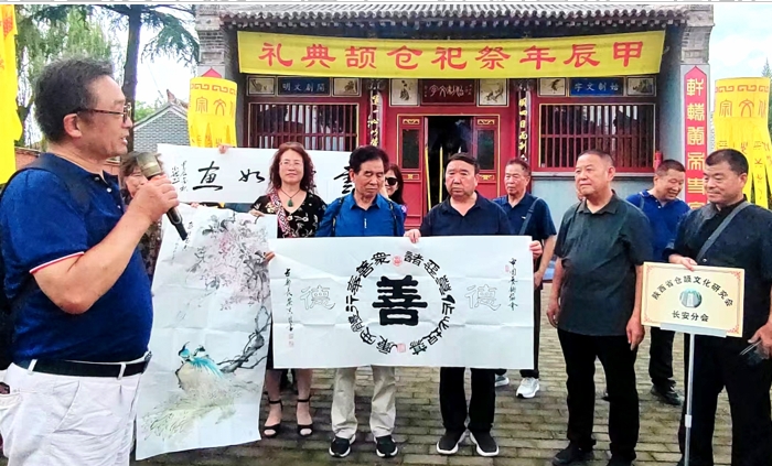 此次研學(xué)交流中,由長(zhǎng)安分會(huì)副會(huì)長(zhǎng)盧小龍主持,把長(zhǎng)安分會(huì)會(huì)員及書(shū)畫(huà)老師們精心準(zhǔn)備的書(shū)畫(huà)作品回贈(zèng)給陪同的縣文旅局同志和歧山分會(huì)同仁們。長(zhǎng)安分會(huì)對(duì)岐山蒼頡廟遺址和蒼頡墓遺址的考察調(diào)研,不僅深入了解了當(dāng)?shù)氐奈幕滋N(yùn),也為倉(cāng)頡文化的傳承與發(fā)展提供了新的思路和方向。