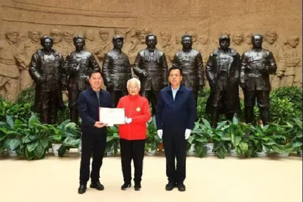 延安革命紀(jì)念地管理局黨政辦公室主任李秀忠向劉玉蘭老人頒發(fā)捐贈文物收藏證書