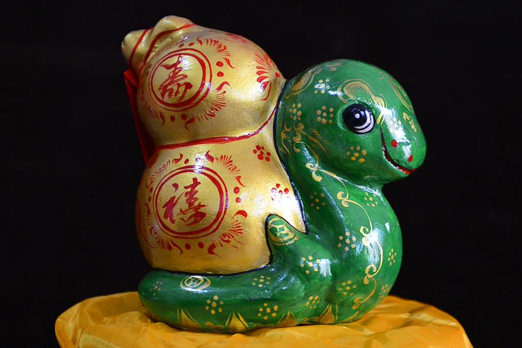 筆者在泥塑藝人黃忠祥的工作室看到,以生肖蛇為題材的系列作品擺滿了整個工作臺。一只只身背“金葫蘆”的“巳蛇”整整齊齊地排在一起,等待黃忠祥夫婦為它們描摹上色,旁邊擺放的已經(jīng)完工的泥塑“福祿壽喜”蛇形神兼?zhèn)?,栩栩如生,惹人喜愛。相較于往年的蛇年主題泥塑,今年的圖案中加入漢字書寫,以大膽的創(chuàng)新為基礎,蘊含著對來年美好的寓意。