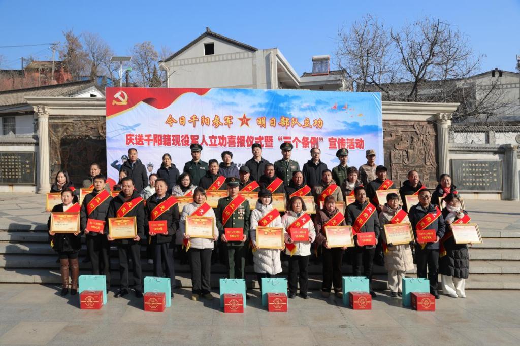 為弘揚(yáng)擁軍優(yōu)屬的光榮傳統(tǒng),切實(shí)提升軍人軍屬的榮譽(yù)感,營(yíng)造關(guān)愛(ài)關(guān)愛(ài)功臣模范的良好氛圍,1月16日,寶雞市千陽(yáng)縣舉行了“建功軍營(yíng)‘戎’耀家鄉(xiāng)”為主題的慶送千陽(yáng)籍現(xiàn)役軍人立功喜報(bào)儀式暨“三個(gè)條例”宣傳活動(dòng)。