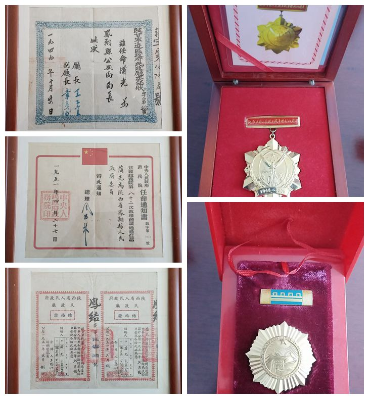 3月22日,蒲力民先生在西安為父親蒲光舉辦誕辰100周年追思會暨歷史文獻捐贈儀式。向鳳翔區(qū)委黨史研究室捐贈的歷史文獻主要有蒲光同志榮獲的中國人民解放軍獨立功勛榮譽章、中國人民抗日戰(zhàn)爭勝利60周年紀念章、陜甘寧邊區(qū)政府民政廳委任狀、中央人民政府政務院任命通知書等5件原件。這些文獻資料,承載著蒲光同志的革命歷程與崇高精神和共產(chǎn)黨人的家風傳承,是深入研究鳳翔黨史、傳承紅色基因的無價之寶。