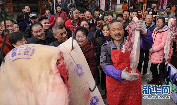 當(dāng)?shù)赝霖i飼養(yǎng)戶在留侯老街上拍賣自家飼養(yǎng)的土豬肉(2015年11月28日)。