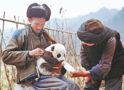 1991年冬天,陜西佛坪國家級自然保護區(qū)管理局員工汪鐵軍和同事冒雪巡山。行至三官廟,見一只大熊貓幼崽趴在雪地枯草里,奄奄一息。汪鐵軍趕忙把它摟進棉襖里,一行人跋涉?zhèn)z小時,摸黑趕回三官廟村?!昂伍L林家小孫子剛1歲,他家肯定有奶粉!”