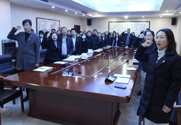 全體黨員莊嚴(yán)肅立,舉起右拳重溫入黨誓詞