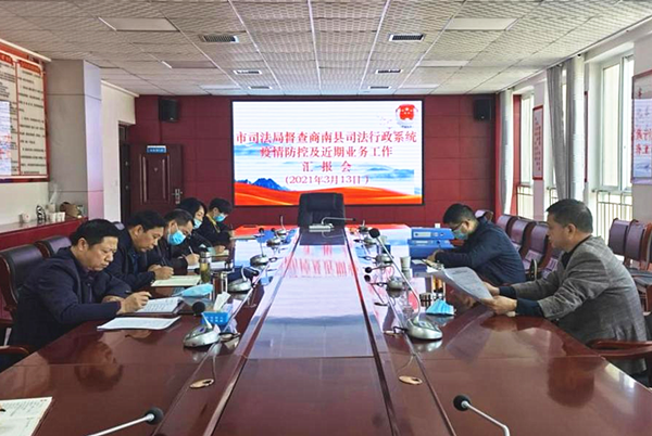 隨后,在縣司法局召開(kāi)了疫情防控工作及近期業(yè)務(wù)工作匯報(bào)會(huì)。會(huì)上,縣司法局黨組書(shū)記、局長(zhǎng)周建國(guó)就全縣司法行政系統(tǒng)疫情防控及近期業(yè)務(wù)工作開(kāi)展情況進(jìn)行了簡(jiǎn)要匯報(bào)。市司法局黨組成員、副局長(zhǎng)李學(xué)哲重點(diǎn)傳達(dá)了市長(zhǎng)王青峰在全市新冠肺炎疫情防控工作視頻會(huì)上的講話精神,并對(duì)商南縣司法行政系統(tǒng)疫情防控工作給予充分肯定,認(rèn)為該縣司法行政系統(tǒng)疫情防控工作呈現(xiàn)出重視程度高、措施落得細(xì)、責(zé)任夯得實(shí)、底線守得牢等特點(diǎn)。