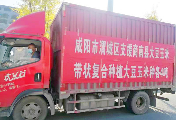 4月10日,兩輛滿載著玉米、大豆種子和復(fù)合肥的大卡車,從咸陽市秦都區(qū)和渭城區(qū)出發(fā)抵達(dá)商洛市商南縣境內(nèi),為商南縣疫情防控背景下如期完成春季農(nóng)業(yè)生產(chǎn)暨大豆玉米帶狀復(fù)合種植工作解了燃眉之急。