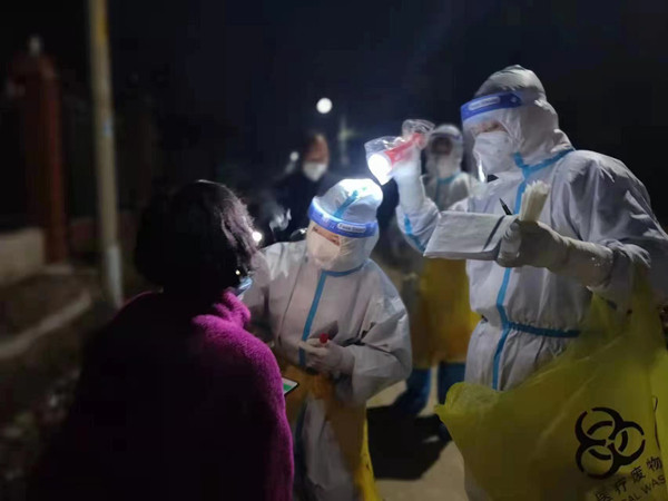 在這天寒地凍的戶外采集核酸,她的面罩很快就起霧了,水汽在她睫毛上結(jié)成了冰花,視線變得模模糊糊,為了節(jié)省時間,為了節(jié)省物資,她顧不得換面罩和口罩,只是使勁瞇一會兒眼睛用體溫融化掉睫毛上的冰花再繼續(xù),為了盡快完成采樣篩查出陽性病例,遇到人口多的村子,她常常從早上一直忙到天黑,不吃飯不喝水不上廁所,嗓子發(fā)炎上火了就喝點三黃片應(yīng)付一下,從不叫苦。因為她知道,抗疫其實就是在與病毒爭鋒,和時間賽跑!