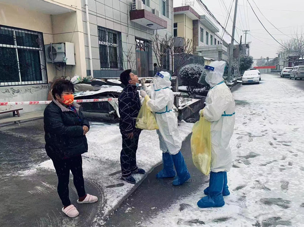 12月25日當(dāng)天氣溫零下8度,數(shù)九寒天,寒風(fēng)凜冽,大雪磅礴。村主任提出:“今天集中采樣吧,你們腳下太滑入戶不安全……”她斷然拒絕:“不行,集中傳播風(fēng)險太大,我們還是入戶!”穿上靴套,行走在雪地里真的是一走三哧溜,任憑刺骨的寒冷在她的身體上見縫插針,入戶核酸采集她絲毫沒有懈怠,采集20多戶時已凍的瑟瑟發(fā)抖,但為了及時完成任務(wù)盡早篩查出陽性病例,她沒有停下手中的工作,顫巍巍的將一個咽拭子掰斷,凍僵的手使勁才將采集管擰緊,手太用力了腳下一滑重重的跌坐在地上,隊友趕緊拉她,她卻說:“我沒事,先把這個放好!”她拼盡全力地站了起來,抖抖身上的雪,笑著說:“走,繼續(xù)!”……就這樣,在雪地里踉踉蹌蹌地采完樣本已是下午了。