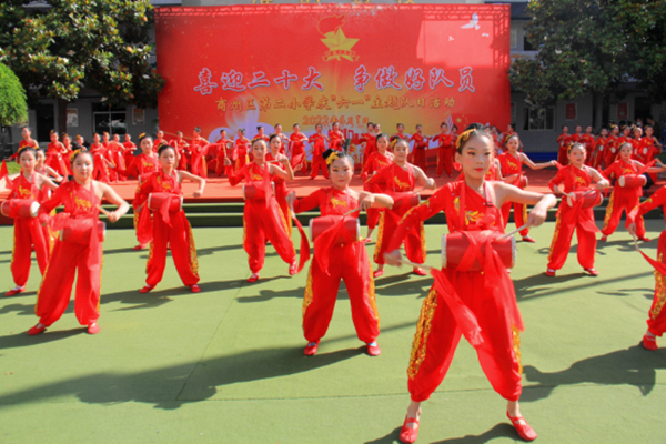 表彰會后,全校師生觀看了精彩的文藝演出。喜慶的腰鼓舞《盛世歡騰》表達了對祖國的美好祝福,隨之,20個精彩節(jié)目陸續(xù)上演,既有源遠流長的古典詩文朗誦《木蘭詩》《沁園春·長沙》、優(yōu)雅曼妙的古典舞《麗人行》,又有活力四射的現(xiàn)代舞《中國少年郎》、朝氣蓬勃的非洲手鼓《炫酷少年》,有合唱《迷人的火塘》《祖國在我心窩里》、器樂合奏《童韻之聲》、環(huán)保時裝走秀,有贊揚勞動的舞蹈《勞動最光榮》,有緬懷先烈歌頌祖國的經(jīng)典舞蹈《紅星閃閃》《時刻準備著》《萬疆》等,還有畢業(yè)班學子表演的舞蹈《不說再見》《鳳凰花開的路》……形式多樣的節(jié)目,傳遞出少年兒童最真摯的心聲,活動現(xiàn)場,歌聲、笑聲、掌聲接連不斷,為節(jié)日增添了喜慶的氣氛。