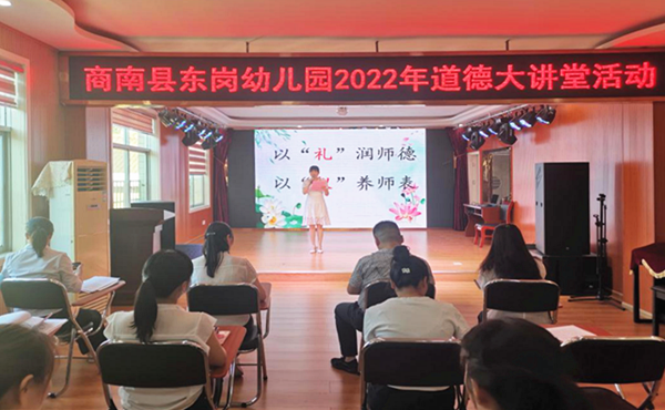 為全面提升全園教師文明禮儀素養(yǎng),進一步推進師德師風(fēng)建設(shè),塑造良好的教師職業(yè)形象,6月14日,商南縣東崗幼兒園開展了“以‘禮’潤師德,用‘儀’養(yǎng)師表”為主題的道德大講堂活動。此次活動由唱歌曲、做自問、誦經(jīng)典、聽講座、談感悟、展風(fēng)采六個環(huán)節(jié)組成。