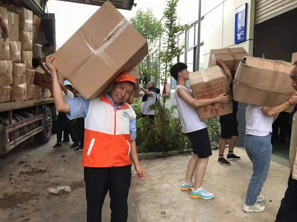 (薛存虎在花石浪物流中心卸載捐贈(zèng)物資)