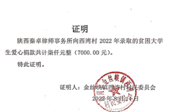 扶貧濟困,用行動構建和諧社會;解囊相助,讓愛心傳承中華美德。陜西秦卓律師事務所在商南縣司法局的正確領導下,始終秉持發(fā)展和公益并行的理念,致力于提供專業(yè)、優(yōu)質、高效法律服務的同時,聚焦群眾實事,用實際行動詮釋社會責任,傳遞社會“正能量”,真正把“我為群眾辦實事”落實在具體行動中。