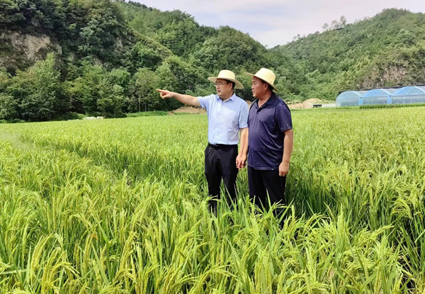 告別溪樂谷時(shí)太陽(yáng)正紅,姚猛頂著烈日繼續(xù)趕往十公里外的眉底村蘇陜協(xié)作水稻新品種試驗(yàn)基地。嗅著沁人心脾的稻香,看著眼前150畝水稻正揚(yáng)花灌漿,豐收在望,姚猛忍不住俯身輕折一串稻穗,拿在手中端詳。來自魚米之鄉(xiāng)的姚猛種過麥子、割過水稻,內(nèi)心對(duì)土地有著很深的親農(nóng)情結(jié)。他穿過試種的幾塊稻田,仔細(xì)比對(duì)新品種的品質(zhì),看著他親自引進(jìn)的明粳186和徐粳119長(zhǎng)勢(shì)旺盛、顆粒飽滿時(shí),饒有興趣地和基地負(fù)責(zé)人在田間暢談并合影留念。走出水稻田已近12點(diǎn),姚猛和大家一起品嘗了基地大棚引種的西紅柿等果蔬壓壓饑,詳細(xì)聽取了基地負(fù)責(zé)人關(guān)于擴(kuò)大水稻種植面積、藕魚種養(yǎng)、稻蝦種養(yǎng)方面的設(shè)想,表示明年要加大資金扶持稻田養(yǎng)殖和水稻種植相結(jié)合的發(fā)展模式,讓群眾依靠這項(xiàng)產(chǎn)業(yè)獲取更多的收益。