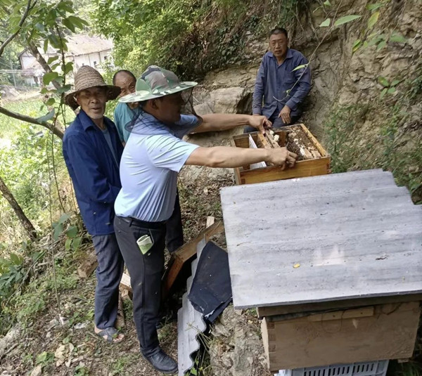 “村上給我發(fā)了5箱中華蜂,我自己又增加了5箱,門前面那一大片瓜蔞地里開的花是上好的蜜源,這里養(yǎng)出來的蜂、割的蜜都是真正純天然的土蜂蜜,光是上半年就賣了4000多塊,既不耽誤干農(nóng)活,又能在家門口就有收入?!痹摯妩S泥河組傅耀永高興地說道。