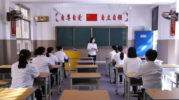 班主任李淑榮進(jìn)班宣布“8月15日下午1點(diǎn)到5點(diǎn)在萬某廣場出現(xiàn)陽性病例,現(xiàn)在排查此時(shí)間段在萬某廣場的密接人員”;學(xué)生們開始回憶并一一作答。其中一名“學(xué)生”趙芬舉手說自己此時(shí)間段確實(shí)在萬某廣場,班主任第一時(shí)間先引導(dǎo)學(xué)生們疏散開來,與該女生拉開距離原地待命,接著迅速撥通電話報(bào)告和請(qǐng)示疫情防控組領(lǐng)導(dǎo)舒會(huì)云副校長,隨即由其中一名工作人員將密接女生帶往隔離室,啟動(dòng)應(yīng)急處置流程;