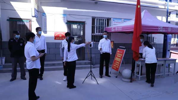 學(xué)校門口,由老師扮演學(xué)生從南、北兩路有序入校,要求佩戴口罩,每人間隔1米,通過測(cè)溫、消毒等環(huán)節(jié)進(jìn)入校園,當(dāng)值班老師發(fā)現(xiàn)一“學(xué)生”程倩怡通過測(cè)溫通道時(shí)體溫異常,一名老師立即將學(xué)生通過規(guī)定路線帶入臨時(shí)休息區(qū),校醫(yī)進(jìn)行二次測(cè)溫,并詢問該生近14天內(nèi)有無疫情重點(diǎn)地區(qū)旅居史、途經(jīng)史或與確診、疑似病例接觸史,并做好詳細(xì)記錄。