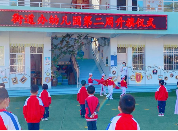 在藍(lán)天下,迎著朝陽,幼兒園舉行了莊嚴(yán)地升國旗儀式。伴隨著雄壯有力的國歌,鮮艷的五星紅旗冉冉升起,讓孩子們感受到了濃烈的節(jié)日氛圍。