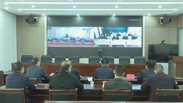 鎮(zhèn)安縣政協(xié)主席楊清平主持視頻座談會??h委常委、常務(wù)副縣長劉學(xué)智,陜西鎮(zhèn)安抽水蓄能電站項(xiàng)目管理處副處長張華文,國網(wǎng)新源西北分公司副總經(jīng)理孫志炯參加視頻座談。(李翔)