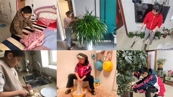 習(xí)勞動(dòng),知感恩。居家學(xué)習(xí)期間,同學(xué)們做到了學(xué)習(xí)、勞動(dòng)兩不誤,積極學(xué)習(xí)各項(xiàng)家務(wù)勞動(dòng),收拾房間、做飯洗碗、打掃衛(wèi)生、整理床鋪、洗衣服、倒垃圾、澆花……當(dāng)起了父母的好幫手,做力所能及的家務(wù)。體會(huì)到父母的辛勞,增長(zhǎng)了勞動(dòng)技能,增強(qiáng)了自理能力,更學(xué)會(huì)了感恩,通過親身體驗(yàn),孩子們逐漸體會(huì)到家長(zhǎng)的不容易,懂得了寬容和理解,家庭責(zé)任感也與日俱增。