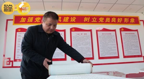 眼前這幅長卷書法作品是黨的二十大報告全文,這是商洛市商州區(qū)職業(yè)高級中學(xué)一位58歲的老師辛建偉,用毛筆一字不落摘抄下來的長卷,作品長30多米,歷時十天完成。辛老師是一名擁有38年黨齡的老黨員。當(dāng)黨的二十大會議召開時,坐在電視機前收聽收看了直播盛況,他就懷著一顆對黨的赤城之心,投入到摘抄二十大報告全文的行動中。