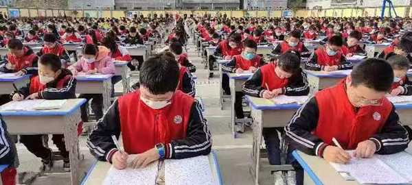 活動(dòng)要求,全鎮(zhèn)各學(xué)校共2000余名一至六年級(jí)小學(xué)生集體參賽。各校統(tǒng)一在學(xué)校操場(chǎng)進(jìn)行,提前將桌凳在操場(chǎng)擺放整齊,左右間隔距離一樣,布滿操場(chǎng)。學(xué)生統(tǒng)一著校服。比賽統(tǒng)一發(fā)書寫紙,一二年級(jí)用鉛筆書寫,3-6年級(jí)用黑色中性筆或者黑色鋼筆書寫。學(xué)生在規(guī)定的時(shí)間內(nèi)抄完規(guī)定的內(nèi)容,在規(guī)定的位置書寫學(xué)號(hào)、學(xué)校、年級(jí)、姓名。未把內(nèi)容寫完整或用藍(lán)色等其它顏色筆的,未在規(guī)定位置書寫姓名等信息的不能參評(píng)。鎮(zhèn)中心校統(tǒng)一規(guī)定評(píng)分標(biāo)準(zhǔn),要求學(xué)生作品書寫規(guī)范、正確、整潔、美觀,字跡大小勻稱,整體效果好。各校學(xué)生作品分年級(jí)收回,鎮(zhèn)中心校組織人員分年級(jí)裝訂,每30份裝一沓,統(tǒng)一組織評(píng)獎(jiǎng)各年級(jí)的前100名。