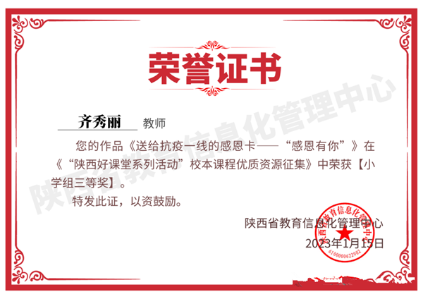 揮灑辛勤汗水,收獲成功喜悅。熱烈祝賀在2022“陜西好課堂”—校本課程優(yōu)質(zhì)資源征集評(píng)選活動(dòng)中,商州區(qū)第二小學(xué)榮獲優(yōu)秀組織獎(jiǎng)。商州區(qū)第二小學(xué)韓寶珍、張亮、張文萍、武燕麗、齊秀麗、李青、金防陣、薛濤、王波九位老師的作品獲獎(jiǎng)。