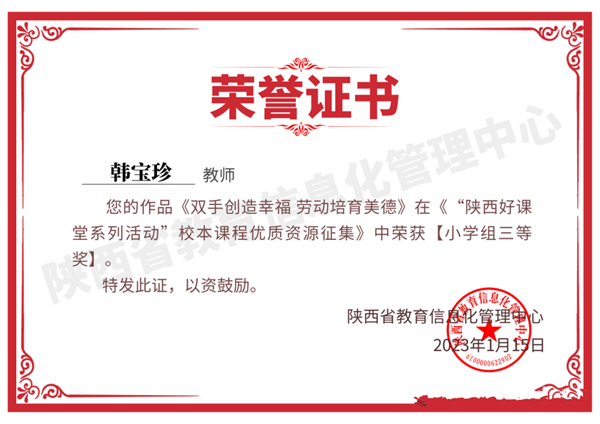 在“雙減”與教育優(yōu)質(zhì)均衡的背景下,學(xué)校對(duì)校本課程不斷深化研究,搭建教師成長(zhǎng)的平臺(tái),著力提升教育教學(xué)質(zhì)量。根據(jù)《關(guān)于開(kāi)展“陜西好課堂”網(wǎng)絡(luò)大賽及“雙減”工作優(yōu)秀案例征集展示交流培訓(xùn)系列活動(dòng)的通知》(陜信教〔2022〕8號(hào))的文件精神,商州區(qū)第二小學(xué)認(rèn)真籌備,精心組織,鼓勵(lì)教師積極參與。最終,韓寶珍、張亮、張文萍、武燕麗、金防陣、李青、齊秀麗、薛濤、王波九位老師的作品在全省2329件作品中脫穎而出,在陜西省校本課程優(yōu)質(zhì)資源征集評(píng)比活動(dòng)中獲獎(jiǎng)!