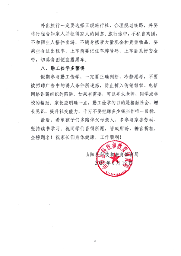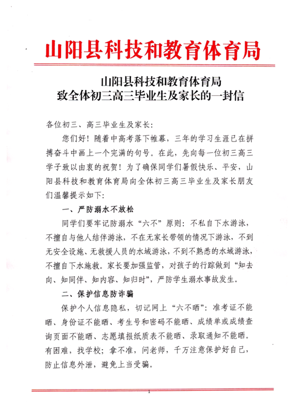 您們好!隨著中高考落下帷幕,三年的學(xué)習(xí)生涯已在拼搏奮斗中畫上一個(gè)完滿的句號(hào)。在此,先向每一位初三高三學(xué)子致以由衷的祝賀!為了確保同學(xué)們暑假快樂、平安,山陽(yáng)縣科技和教育體育局向全體初三高三畢業(yè)生及家長(zhǎng)朋友們溫馨提示如下: