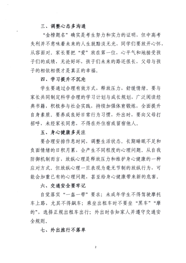 學(xué)生要通過合理有效方式,釋放壓力,舒緩情緒。要與家長(zhǎng)共同制定科學(xué)合理的學(xué)習(xí)計(jì)劃與成長(zhǎng)規(guī)劃,廣泛閱讀經(jīng)典書籍,積極參與社會(huì)實(shí)踐,持續(xù)加強(qiáng)體育鍛煉,全面提升自身素質(zhì)。要養(yǎng)成良好日常行為習(xí)慣,外出時(shí),要向父母打招呼,未經(jīng)家長(zhǎng)同意,不得在外住宿或留宿他人。