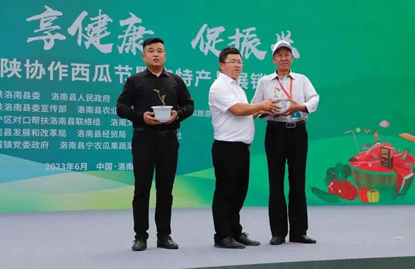 1991年江寧洛南開啟對口幫扶。32年來,寧洛兩地在政治、經(jīng)濟(jì)、文化等全方位多領(lǐng)域協(xié)作。特別是2017年以來,兩地認(rèn)真貫徹落實(shí)習(xí)近平總書記關(guān)于東西部扶貧協(xié)作的重要指示精神,開啟新一輪對口協(xié)作。他們堅(jiān)持產(chǎn)業(yè)優(yōu)先,因地制宜實(shí)施優(yōu)質(zhì)特色產(chǎn)業(yè)轉(zhuǎn)移,江寧橫溪西瓜的“南瓜北移”就是蘇陜協(xié)作產(chǎn)業(yè)融合的成功典范。首屆蘇陜協(xié)作西瓜節(jié)暨農(nóng)特產(chǎn)品展銷活動(dòng)一方面通過展示協(xié)作成果,讓大家更深入地了解寧洛協(xié)作,參與寧洛協(xié)作,受益寧洛協(xié)作;另一方面以此為契機(jī),強(qiáng)化蘇陜涉農(nóng)企業(yè)協(xié)作互動(dòng),推進(jìn)農(nóng)業(yè)產(chǎn)業(yè)鏈產(chǎn)品互促互銷,助力寧洛協(xié)作產(chǎn)品走出洛南,為寧洛協(xié)作工作進(jìn)一步深入開展注入新活力。
