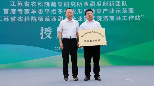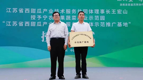 授牌儀式上,江蘇省農(nóng)科院蔬菜研究所西甜瓜創(chuàng)新團(tuán)隊(duì)首席專家羊杏平授予洛南縣寧農(nóng)瓜果蔬菜產(chǎn)業(yè)示范園“江蘇省農(nóng)科院橫溪西甜瓜產(chǎn)業(yè)研究院洛南縣工作站”牌匾;江蘇省西甜瓜產(chǎn)業(yè)技術(shù)服務(wù)共同體理事長王宏山授予洛南縣寧農(nóng)瓜果蔬菜產(chǎn)業(yè)示范園“江蘇省西甜瓜產(chǎn)業(yè)技術(shù)服務(wù)共同體示范推廣基地”牌匾。